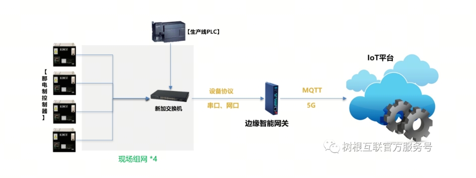 現場共計35臺獨立的焊接設備控制器,相互之間未聯網,綜合數據采集成本,需首先構建4組小型局域網將焊接控制器數據和匯總至4臺交換機。再分別從4臺交換機加裝邊緣智能網關,通過5G將數據匯總至該企業IoT平臺統一存儲。