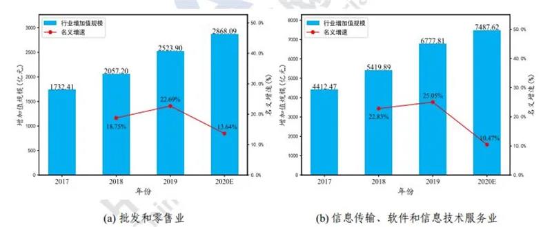 工業(yè)互聯(lián)網(wǎng)推動制造業(yè)與批發(fā)零售業(yè)的融通發(fā)展。如下圖a所示,據(jù)測算, 2019 年,工業(yè)互聯(lián)網(wǎng)帶動批發(fā)和零售業(yè)的增加值規(guī)模為 2523.90億元,名義增速為 22.69%,增速同比提升 3.32%;帶動就業(yè) 198.34 萬人。預(yù)計 2020 年,工業(yè)互聯(lián)網(wǎng)帶動批發(fā)和零售業(yè)的增加值規(guī)模為 2868.09 億元,新增就業(yè)人數(shù) 14.67 萬人,帶動就業(yè)人數(shù)將達(dá)到 213.01 萬人,成為制造業(yè)和信息產(chǎn)業(yè)之后, 第三個由工業(yè)互聯(lián)網(wǎng)帶動就業(yè)人數(shù)超過 200 萬人的產(chǎn)業(yè)。