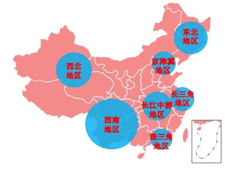 重點區(qū)域協(xié)同推進(jìn)工業(yè)互聯(lián)網(wǎng)發(fā)展。近年來,《京津冀協(xié)同發(fā)展規(guī)劃綱要》、《長江三角洲區(qū)域一體化發(fā)展規(guī)劃綱要》、《長江經(jīng)濟(jì)帶發(fā)展規(guī)劃綱要》和《粵港澳大灣區(qū)發(fā)展規(guī)劃綱要》等政策的發(fā)布,為各大重點區(qū)域的協(xié)調(diào)發(fā)展提供了政策指南(我國的重點區(qū)域分布如下圖所示)。