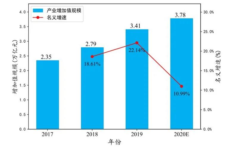 我國工業(yè)互聯(lián)網(wǎng)產(chǎn)業(yè)增加值規(guī)模持續(xù)擴(kuò)大。據(jù)測算, 2019 年我國工業(yè)互聯(lián)網(wǎng)產(chǎn)業(yè)增加值規(guī)模達(dá)到 3.41 萬億元,名義增速達(dá)到 22.14%,增速同比增長 2.97 個百分點,其中工業(yè)互聯(lián)網(wǎng)直接產(chǎn)業(yè)增加值規(guī)模為 0.92 萬億元,名義增速達(dá)到 19.86%,增速同比增長 3.96 個百分點,工業(yè)互聯(lián)網(wǎng)滲透產(chǎn)業(yè)增加值規(guī)模為 2.49 萬億元,名義增速達(dá)到 23.01%,增速同比增長 2.57 個百分點。在抗擊新冠肺炎疫情過程中, 社會各界進(jìn)一步加深對工業(yè)互聯(lián)網(wǎng)的認(rèn)識,如下圖所示,預(yù)計 2020 年,工業(yè)互聯(lián)網(wǎng)產(chǎn)業(yè)增加值規(guī)模達(dá)到 3.78 萬億元,成為促進(jìn)我國 GDP 增長的重要因素。