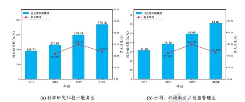在科學(xué)研究和技術(shù)服務(wù)業(yè),如下圖(a) 所示,據(jù)測算, 2019 年,工業(yè)互聯(lián)網(wǎng)帶動科學(xué)研究和技術(shù)服務(wù)業(yè)的增加值為 299.04 億元,名義增速為 30.01%;帶動就業(yè)人數(shù) 23.50 萬人。預(yù)計 2020 年,工業(yè)互聯(lián)網(wǎng)帶動科學(xué)研究和技術(shù)服務(wù)業(yè)的增加值規(guī)模為 370.18 億元,新增就業(yè)人數(shù) 3.99 萬人,帶動就業(yè)人數(shù)將達(dá)到 27.49 萬人。