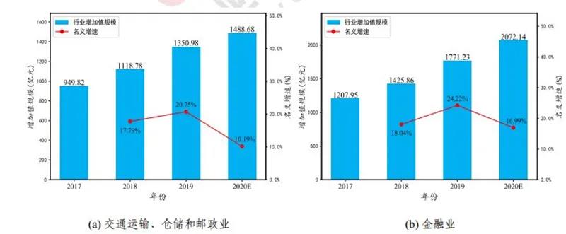 ▲工業(yè)互聯(lián)網(wǎng)帶動交通運輸、倉儲和郵政業(yè),金融業(yè)的增加值規(guī)模