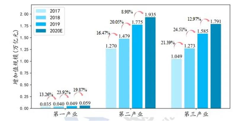 如上圖所示, 據(jù)測算, 2019 年,工業(yè)互聯(lián)網(wǎng)帶動第一產(chǎn)業(yè)、第二產(chǎn)業(yè)、第三產(chǎn)業(yè)的增加值規(guī)模分別為 0.049 萬億元、 1.775 萬億元、 1.585 萬億元,名義增速分別為 23.92%、20.05%、 24.51%,增速同比增長 9.41%、 3.08%、2.57%,工業(yè)互聯(lián)網(wǎng)帶動各行業(yè)的增加值規(guī)模持續(xù)提升。在疫情和經(jīng)濟(jì)下行影響下,預(yù)計 2020 年工業(yè)互聯(lián)網(wǎng)帶動三大產(chǎn)業(yè)增加值規(guī)模仍將高速提升,工業(yè)互聯(lián)網(wǎng)帶動第一產(chǎn)業(yè)、第二產(chǎn)業(yè)、第三產(chǎn)業(yè)的增加值規(guī)模將分別達(dá)到 0.059 萬億元、 1.935 萬億元、 1.791 萬億元。