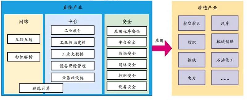工業(yè)互聯(lián)網(wǎng)為實體經(jīng)濟(jì)各個領(lǐng)域的轉(zhuǎn)型升級提供具體的實現(xiàn)方式和推進(jìn)抓手,為產(chǎn)業(yè)變革賦能。 工業(yè)互聯(lián)網(wǎng)的產(chǎn)業(yè)體系包括直接產(chǎn)業(yè)和滲透產(chǎn)業(yè)。工業(yè)互聯(lián)網(wǎng)直接產(chǎn)業(yè)由網(wǎng)絡(luò)、平臺、安全三個部分構(gòu)成,其中網(wǎng)絡(luò)是基礎(chǔ)、平臺是核心、安全是保障。如圖 1所示,“網(wǎng)絡(luò)”是實現(xiàn)各類工業(yè)生產(chǎn)要素泛在深度互聯(lián)的基礎(chǔ),包括網(wǎng)絡(luò)互聯(lián)互通體系和標(biāo)識解析體系。