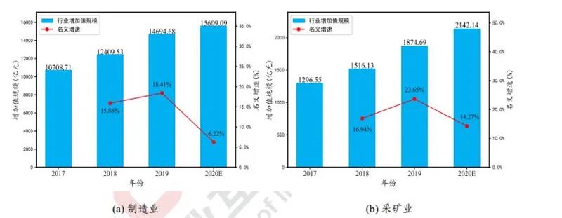 工業(yè)互聯(lián)網(wǎng)賦能礦產(chǎn)開采,保障采礦業(yè)安全生產(chǎn)運行。如上圖(b) 所示,據(jù)測算, 2019 年,工業(yè)互聯(lián)網(wǎng)帶動采礦業(yè)的增加值規(guī)模為 1874.69 億元,名義增速為 23.65%,增速同比提升 5.74%? 帶動就業(yè) 147.32 萬人。預(yù)計 2020 年,工業(yè)互聯(lián)網(wǎng)帶動采礦業(yè)的增加值規(guī)模為 2142.14 億元,新增就業(yè)人數(shù) 11.78 萬人,帶動就業(yè)人數(shù)將達(dá)到 159.10 萬人。我國采礦業(yè)規(guī)模大、分布范圍廣、生產(chǎn)危險性強(qiáng),應(yīng)用工業(yè)互聯(lián)網(wǎng),可以推動采礦業(yè)數(shù)字化、網(wǎng)絡(luò)化、智能化建設(shè),同樣也實現(xiàn)了采礦業(yè)安全與發(fā)展相協(xié)調(diào)的要求。