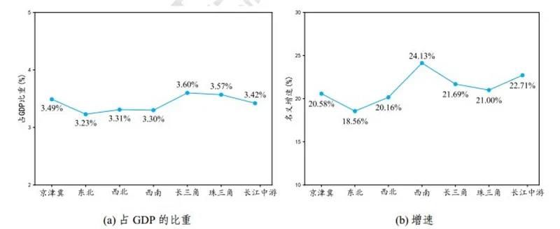 從工業(yè)互聯(lián)網(wǎng)產(chǎn)業(yè)增加值規(guī)模占 GDP 的比重來看,如下圖(a) 所示,據(jù)測算,各區(qū)域的工業(yè)互聯(lián)網(wǎng)產(chǎn)業(yè)增加值規(guī)模占 GDP 的比重均在 3%4%之間,其中長三角地區(qū)占 GDP 的比重最高,達(dá)到 3.60%,珠三角地區(qū)和京津冀地區(qū)緊隨其后,分別為 3.57% 和 3.49%,東北地區(qū)、西南地區(qū)和西北地區(qū)的比重則分別為 3.23%, 3.30% 和 3.31%。