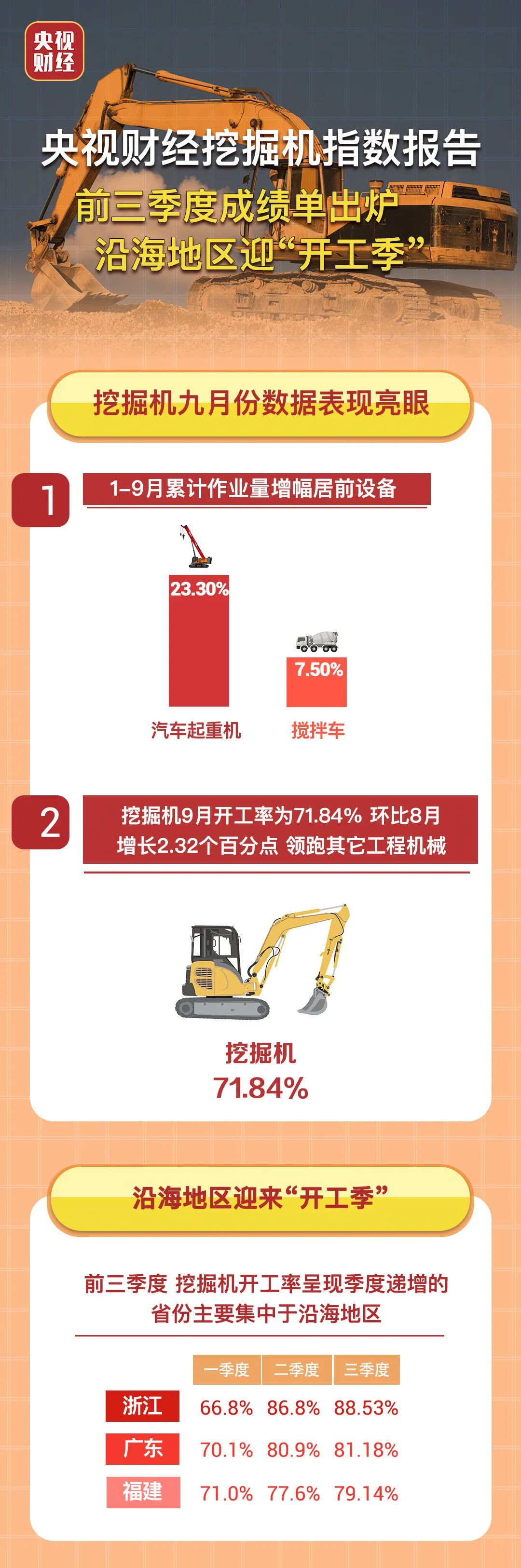 挖掘機是基礎設施建設的“標配”,是反映基礎設施建設、觀察固定資產投資等經濟變化的風向標。央視財經與三一重工、樹根科技聯合打造的“央視財經挖掘機指數”今天發布了前三季度最新成績單。戳一圖,感受中國基建脈搏跳動↓↓↓