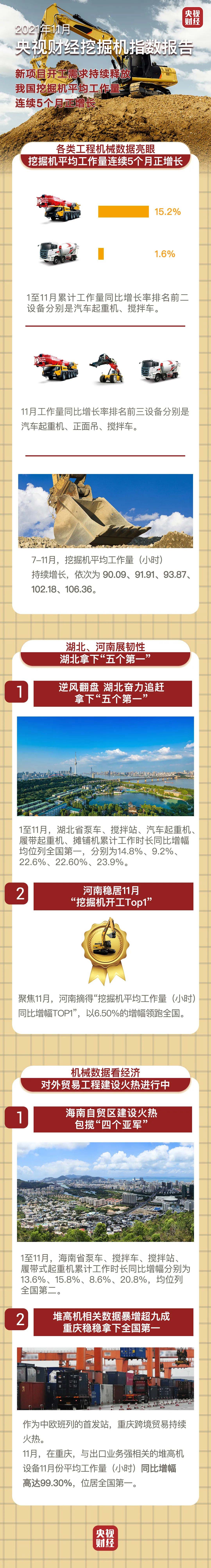 挖掘機(jī)指數(shù)顯示,1-11月,海南省泵車、攪拌車、攪拌站、履帶式起重機(jī)累計(jì)工作時(shí)長(zhǎng)同比增幅位列全國(guó)第二、第二、第二、第二,包攬“四個(gè)亞軍”!