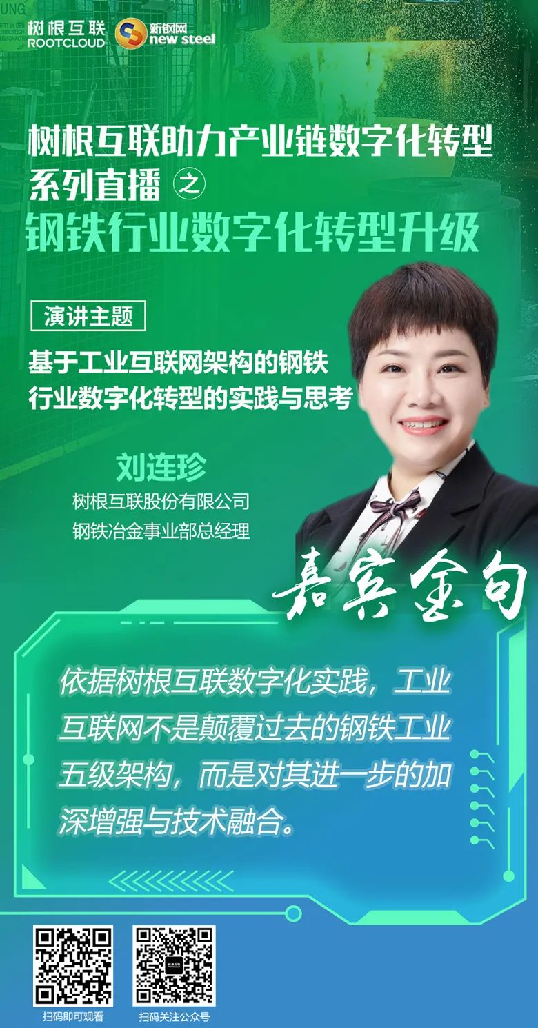 2022年5月7日,在廣州市“鏈長制”辦公室(廣州市工業和信息化局)的指導下,樹根科技作為廣州市“軟件和信創”產業鏈“鏈主”企業,聯合新鋼網舉辦樹根科技助力產業鏈數字化轉型系列直播之“鋼鐵行業數字化轉型升級”活動。 本次直播累計在線觀看達到2300+人次,獲得了鋼鐵行業從業者們的高度關注,活動邀請了張杰斐、吉海星、劉連珍三位行業專家分享了對鋼鐵行業數字化轉型升級的實踐與思考,為廣大鋼鐵企業提供了轉型升級的新思路。