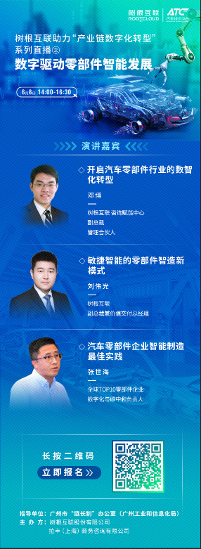 2022年6月8日,在廣州市“鏈長(zhǎng)制”辦公室(廣州市工業(yè)和信息化局)的指導(dǎo)下,樹(shù)根科技聯(lián)合ATC汽車技術(shù)平臺(tái),舉辦樹(shù)根科技助力產(chǎn)業(yè)鏈數(shù)字化轉(zhuǎn)型系列直播之“數(shù)字驅(qū)動(dòng)零部件智能發(fā)展”活動(dòng)。特邀樹(shù)根科技、全球TOP10零部件企業(yè)數(shù)字化專家,線上為聽(tīng)眾帶來(lái)汽車零部件企業(yè)的數(shù)字化轉(zhuǎn)型分享。