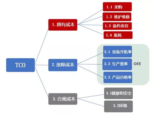 和設備資產管理相關的另一個詞是總擁有成本,英文是Total Cost of Ownership, 簡稱TCO。圖2示例了TCO由三部分構成,即擁有成本、故障成本和合規成本。
