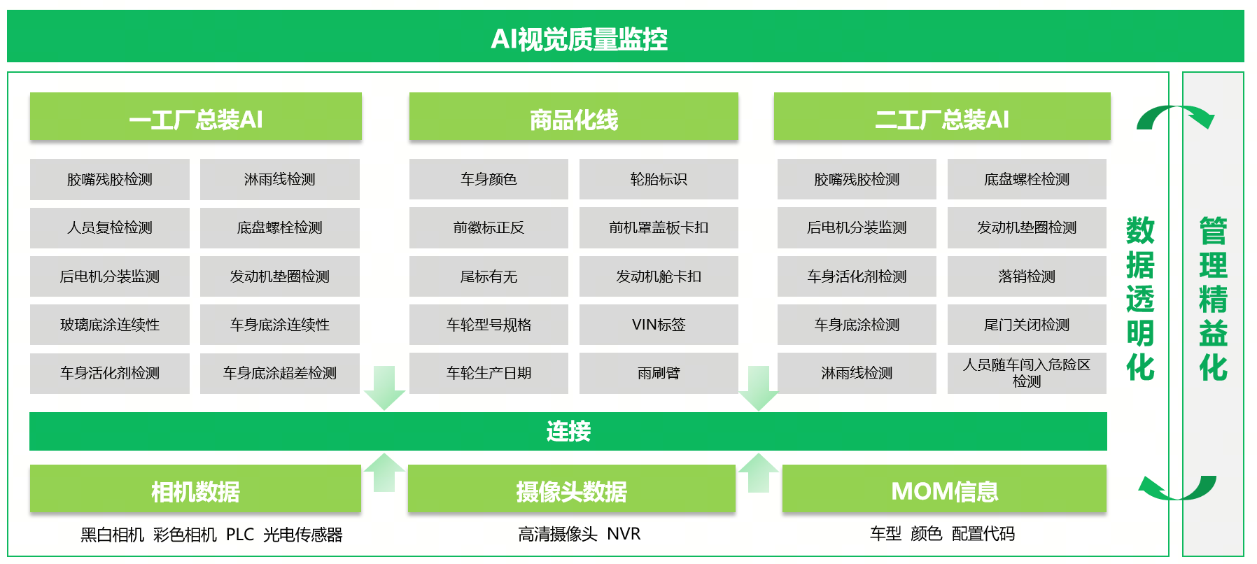 通過工業(yè)相機\攝像頭+AI算法,實現(xiàn)產(chǎn)品質(zhì)量自動檢測、工藝標(biāo)準(zhǔn)化提升,提高質(zhì)量水平和人效。